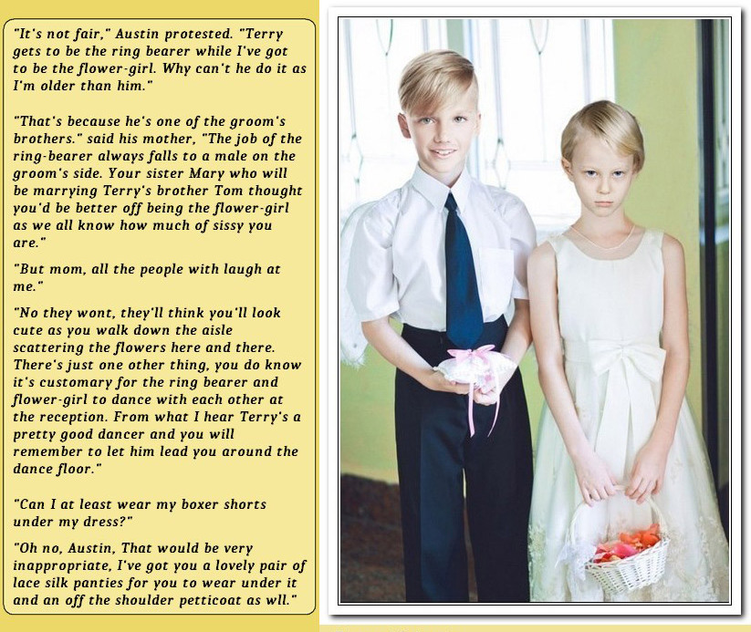 I share this photograph on the subject. It is a sample of a very unusual custom within the marriage rite. Common tradition dictates that the role of the flower girl is played by the bride's little sister or some cousin, niece in a range of 4-12 years. however there is the case where there is no girl available for the role. then and only then a child of the same age range can fulfill the role. This is done in this way to avoid bad luck, a bad omen.