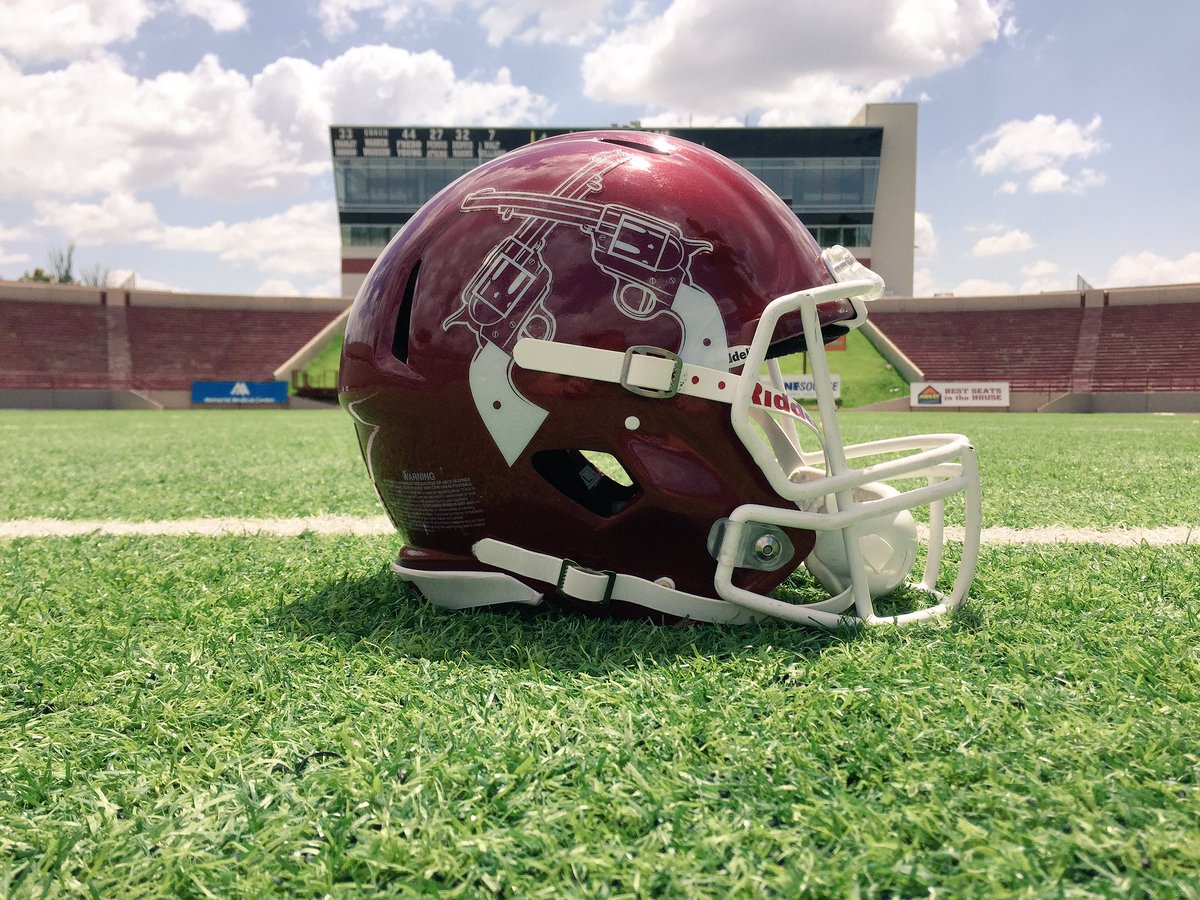 Texas State: BBF-BHI-EJK-LKL [I=white shell, mirror grey bobcat, no stripe, white mask, https://i.imgur.com/UtjJJB2.png; J=black shell, black bobcat, no stripe, white mask, http://www.goccusports.com/view.gal?id=209205; K=white shell, gold bobcat head, burgundy-white-burgundy stripe, white mask, http://nmstatesports.com/common/controls/image_handler.aspx?thumb_prefix=rp_primary&image_path=/images/2017/11/4/Jaleel_Scott_Texas_State_BM17.jpg; L=“B” with a gold bobcat head, http://www.txstatebobcats.com/common/controls/image_handler.aspx?thumb_prefix=rp_primary&image_path=/images/2017/11/11/Williams_passes_the_ball.jpg]